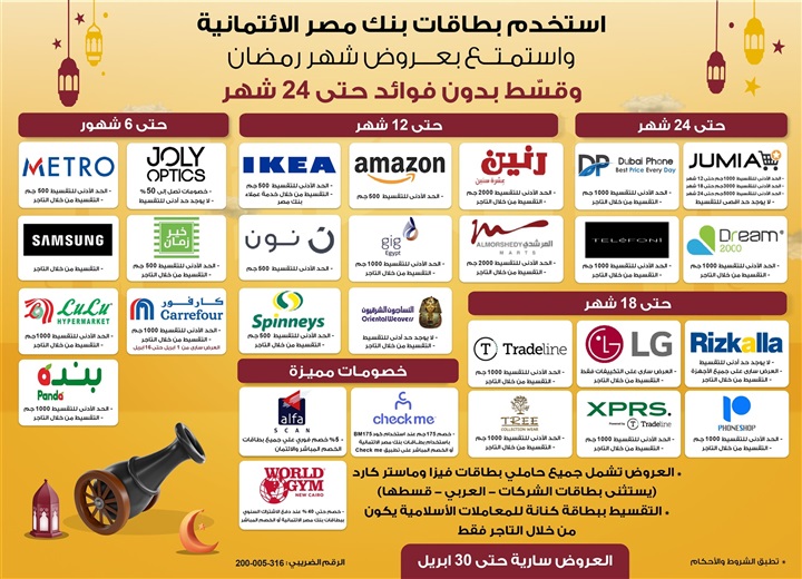 أعلن بنك مصر، عن أحدث عروضه لشهر رمضان، حيث يمكن التقسيط دون فوائد حتى 24 شهرا من العديد من المتاجر والماركات، وذلك باستخدام بطاقات بنك مصر الائتمانية.