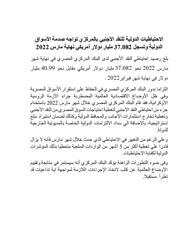 وأكد المركزي، عبر موقعه الرسمي، إنه التزاما بدوره في الحفاظ على استقرار الأسواق المصرية، وفي ظل الأوضاع الاقتصادية العالمية المضطربة جراء الأزمة الروسية الأوكرانية، فقد قام البنك المركزي المصري خلال شهر مارس 2022 باستخدام جزء من احتياطي النقد الأجنبي لتغطية احتياجات السوق المصري من النقد الأجنبي، وتغطية تخارج استثمارات الأجانب والمحافظ الدولية، وكذلك لضمان استيراد سلع إستراتيجية، بالإضافة إلى سداد الإلتزامات الدولية الخاصة بالمديونية الخارجية للدولة.