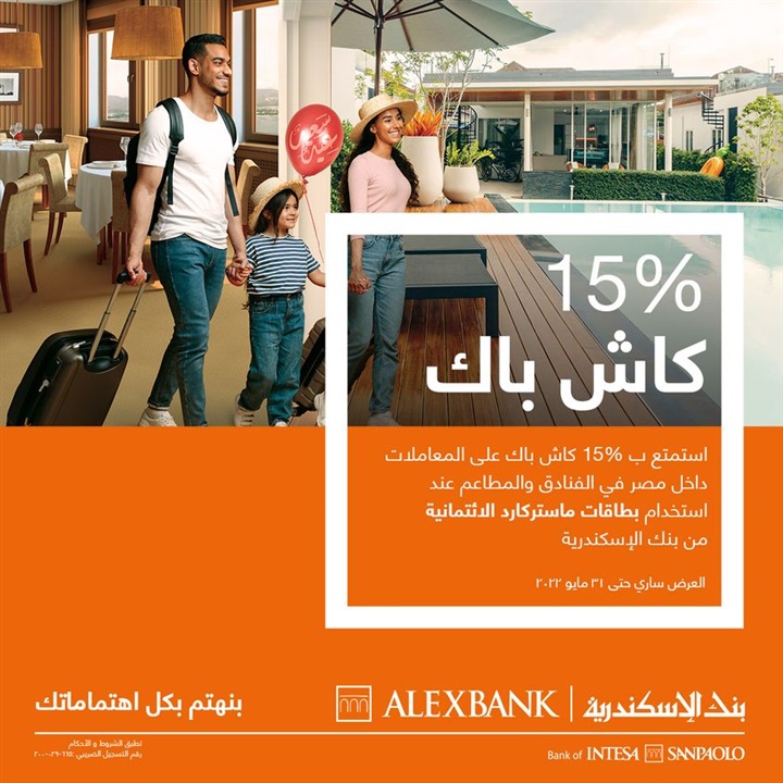 أعلن بنك الإسكندرية، لعملائه عن إمكانية الحصول على كاش باك 15% في الفنادق والمطاعم، وذلك من خلال استخدام بطاقات بنك الإسكندرية ماستركارد الائتمانية.