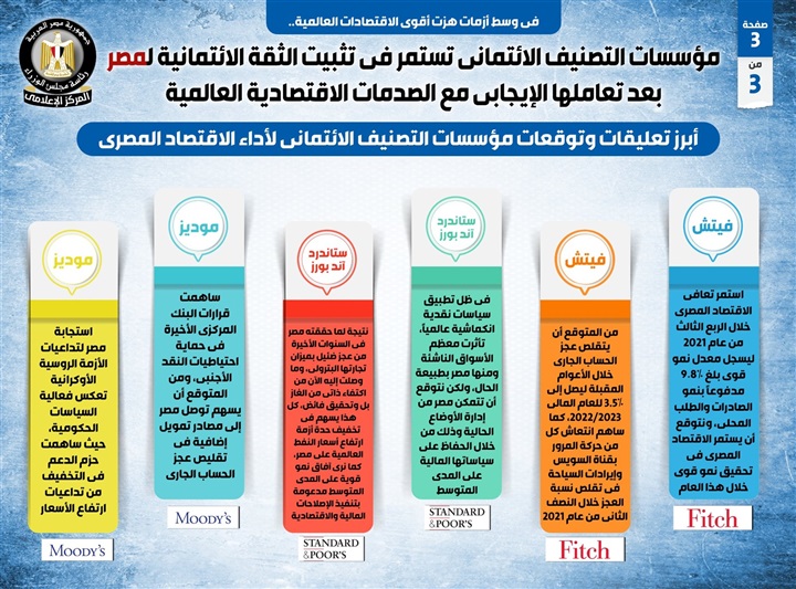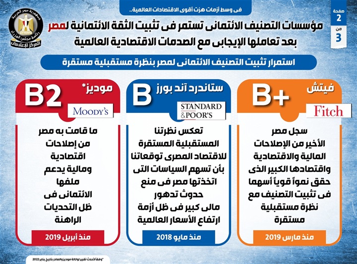 وفي هذا الصدد، نشر المركز الإعلامي لمجلس الوزراء، تقريراً تضمن إنفوجرافات تسلط الضوء على نجاح مصر في الحفاظ على ثقة مؤسسات التصنيف الائتماني بعد تعاملها الإيجابي مع الصدمات الاقتصادية العالمية، في ظل أزمات هزت أقوى الاقتصادات.