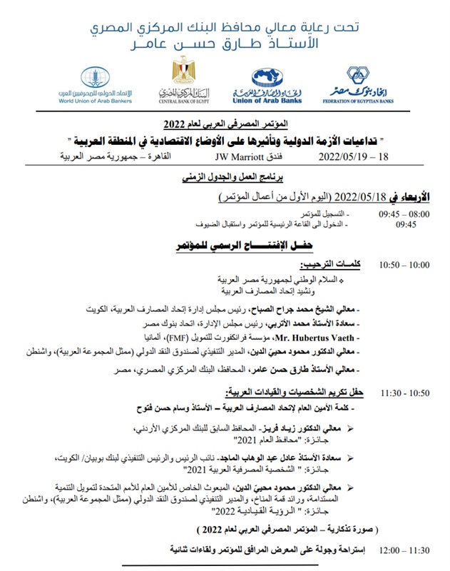 ترصد “بنوك مصر” البوابة الرسمية لاتحاد بنوك مصر أجندة برنامج العمل والجدول الزمني للمؤتمر المصرفي العربي لعام 2022، الذي ينظمه اتحاد المصارف العربية، بالتعاون مع اتحاد بنوك مصر تحت رعاية محافظ البنك المركزي المصري طارق عامر، تحت عنوان “تداعيات الأزمة الدولية وتأثيرها على الأوضاع الاقتصادية في المنطقة العربية”، غدا الأربعاء 18 و19 مايو 2022.