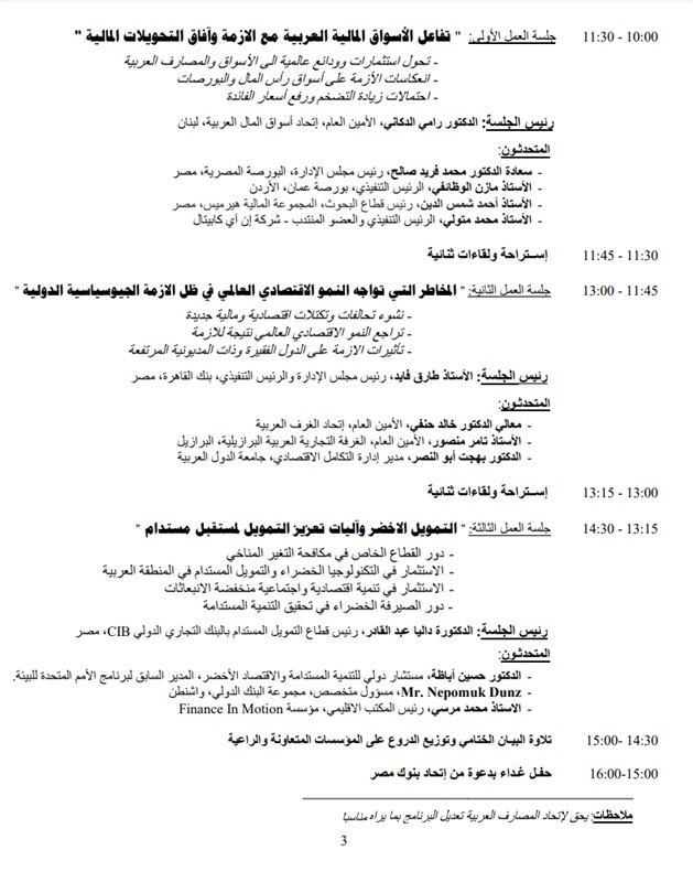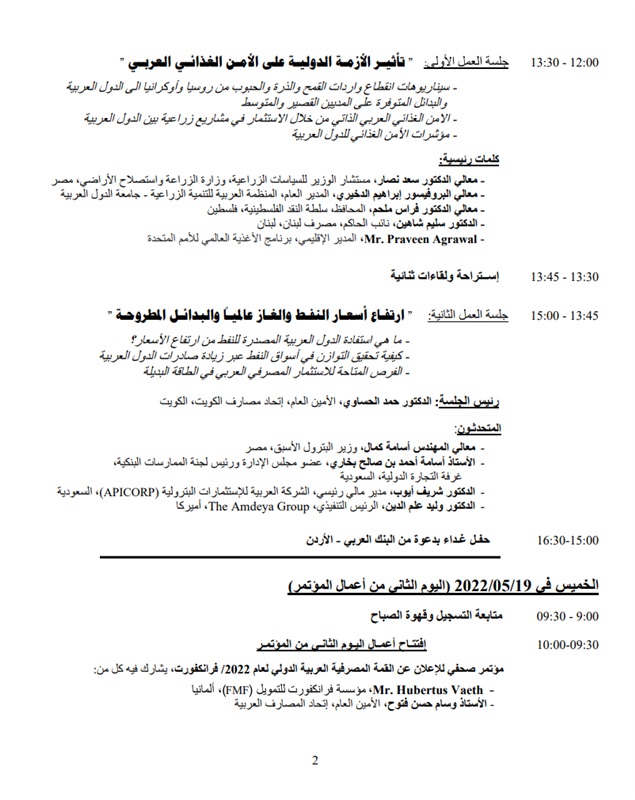 وستناقش فعاليات المؤتمر على مدى خمس جلسات، آخر المستجدات والتطوّرات على الساحتين الدولية والإقليمية فيما يتعلّق بتداعيات الأزمة الدولية وتأثيرها على الأوضاع الاقتصادية في منطقتنا العربية، ومن بينها التحديات والمخاطر التي تواجه الأمن الاقتصادي في ظلّ الأزمة الجيوسياسية الدولية وتأثيرها على الأمن الغذائي العربي، إضافة إلى مناقشة تداعيات أسعار النفط والغاز عالمياً والبدائل المطروحة، وتفاعل الأسواق المالية العربية مع الأزمة وآفاق التحويلات المالية.