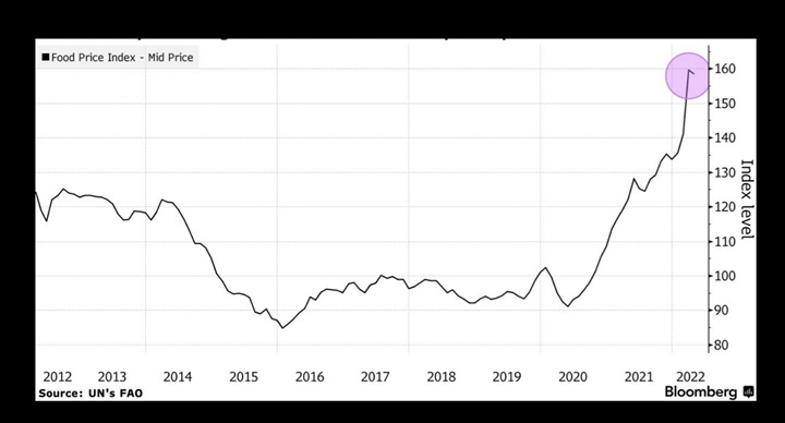 تقترب من مستوياتها القياسية ارتفاع أسعار الأغذية عالمياً مع توقف حركة تجارة المحاصيل الزراعية نتيجة للحرب في أوكرانيا.. أنظر الرسم البياني رقم 1.