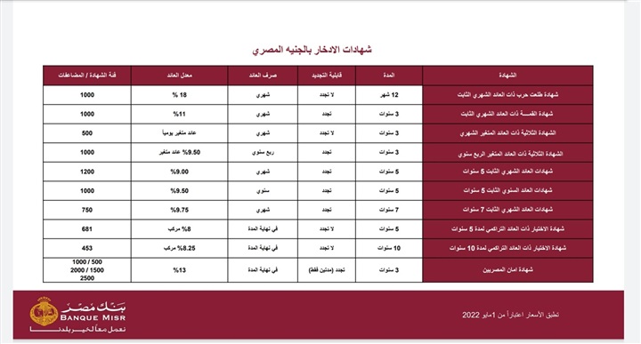 . ترصد بنوك مصر، البوابة الرسمية لاتحاد بنوك مصر، أعلى أسعار الفائدة على شهادات بنك مصر بالعملة المحلية لعام 2022، بعد أن قررت لجنة السياسة النقديـة للبنك المركــزي المصـري في اجتماعهـا يــوم الخميس الموافـــق 19 مايو 2022 رفع سعري عائد الإيداع والإقراض لليلة واحدة وسعر العملية الرئيسية للبنك المركزي بواقع 200 نقطة أساس ليصل إلى 11.25٪، 12.25٪ و11.75٪ على الترتيب. كما تم رفع سعر الائتمان والخصم بواقع 200 نقطة أساس ليصل إلى 11.75٪، وكشف محمد الإتربي رئيس مجلس إدارة بنك مصر، عن أن شهادة الـ 18% مستمرة بدون تعديل، وأنه لا يوجد تعديل على الشهادات الثلاثية ذات العائد الثابت.