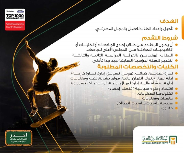 أعلن البنك الأهلي المصري، عن إتاحته لتدريب الطلبة 2022 لتأهيلهم للعمل في القطاع المصرفي، ويمكن التسجيل من اليوم الأحد وحتى يوم الخميس 2 يونيو 2022، وتأتي الشروط والأحكام كالآتي: