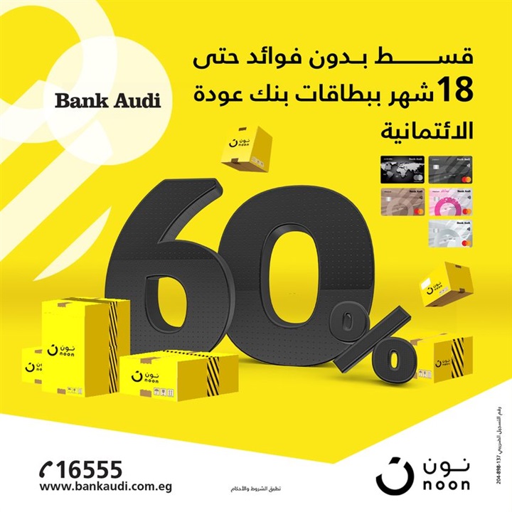 أعلن بنك عوده- مصر، لعملائه عن إمكانية تقسيط المشتريات حتى 18 شهرا دون فوائد من موقع وتطبيق noon Egypt، وذلك عند استخدام بطاقات بنك عوده الائتمانية.