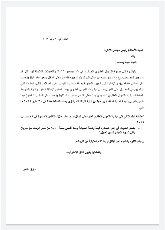 وتابع : ” وبالإشارة إلى الجهود المبذولة بصفة مستمرة للتيسير على العملاء وتذليل العقبات التي تواجههم في الحصول على التمويل ضمن مبادرات التمويل العقاري بهدف تعظيم الاستفادة منها، وأسوة بالشروط المطبقة بمبادرة التمويل العقاري لمحدودي ومتوسطي الدخل بسعر عائد 3% يحسب على أساس متناقص، فيما يتعلق بتمويل وديعة الصيانة، فقد قـرر مجلـس إدارة البنـك المـركـزي بجلســته المنـعقدة في 31 مايو 2022 ما يلي:إضافة البند التالي إلى مبادرة التمويل العقاري لمتوسطي الدخل بسعر عائد 8 %متناقص الصادرة في 19 ديسمبر 2019: