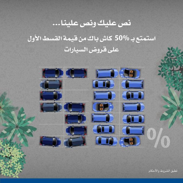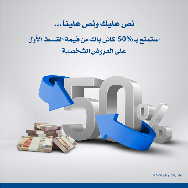 كاش باك 50% من قيمة القسط الأول لكافة القروض الشخصية وقروض السيارات الغير مضمنة.
