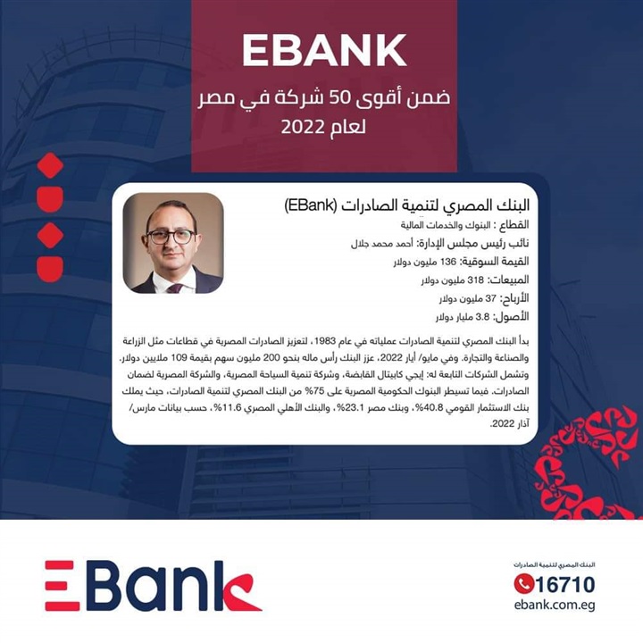 وجاء البنك المصري لتنمية الصادرات EBank ضمن أقوى 50 شركة في مصر لعام 2022، وتبلغ قيمتها السوقية 28.5 مليار دولار، وتتجاوز أصولها 142 مليار دولار.