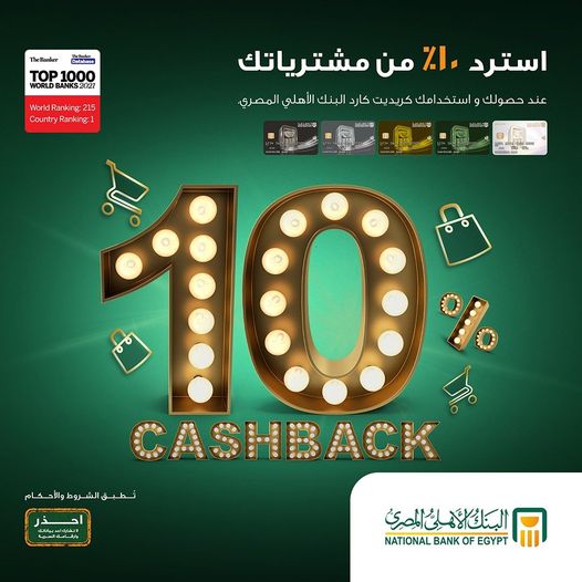 أعلن بنك الأهلي المصري، لعملائه، عن إمكانية الحصول على كاش باك 10% من إجمالي المشتريات، وذلك عند الحصول على بطاقة ائتمان البنك الأهلي المصري بضمان الشهادات خلال شهري يونيو ويوليو 2022.