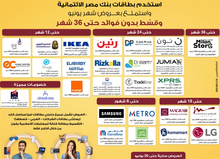 أعلن بنك مصر، عن أحدث عروضه لشهر يونيو، حيث يمكن التقسيط بدون فوائد حتى 36 شهر من العديد من المتاجر والماركات، وذلك باستخدام بطاقات بنك مصر.