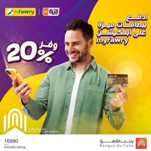 أعلن بنك القاهرة، لعملائه، عن إمكانية الحصول على خصم 20% على من أبلكيشن “Myfawry”، وذلك عند استخدام بطاقات ميزة بنك القاهرة.