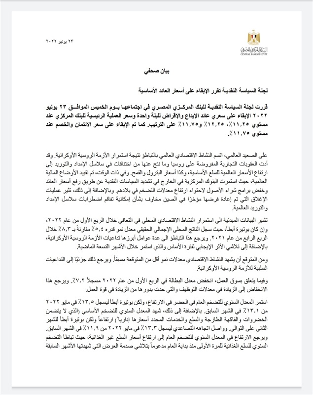 قررت لجنة السياسة النقديـة للبنك المركــزي المصـري في اجتماعهـا يــوم الخميس الموافـــق 23 يونيو 2022 الإبقاء على سعري عائد الإيداع والإقراض لليلة واحدة وسعر العملية الرئيسية للبنك المركزي عند مستوي 11.25٪، 12.25٪ و11.75٪ على الترتيب. كما تم الإبقاء على سعر الائتمان والخصم عند مستوي 11.75٪.