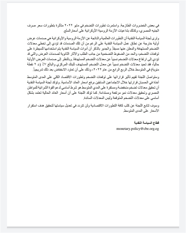 وستواصل اللجنة تقييم تأثير قراراتها على توقعات التضخم وتطورات الاقتصاد الكلي على المدى المتوسط آخذة في الحسبان قرارتها خلال الاجتماعين السابقين برفع اسعار العائد الأساسية. وتؤكد لجنة السياسة النقدية أن تحقيق معدلات تضخم منخفضة ومستقرة على المدي المتوسط هو شرط أساسي لدعم القوة الشرائية للمواطن المصري وتحقيق معدلات نمو مرتفعة ومستدامة. كما تؤكد اللجنة على أن أسعار العائد الحالية تعتمد بشكل أساسي على معدلات التضخم المتوقعة وليس المعدلات السائدة.