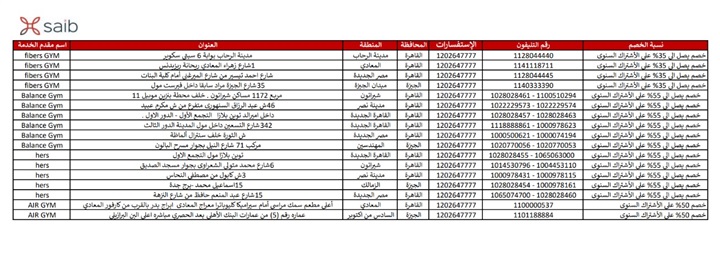 أعلن بنك الشركة المصرفية العربية saib، لعملائه، الحصول على خصومات تصل إلى 55% بعدد من صالات الـ”GYM”، وذلك عند الدفع باستخدام بطاقات بنك Saib.