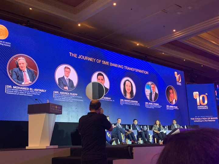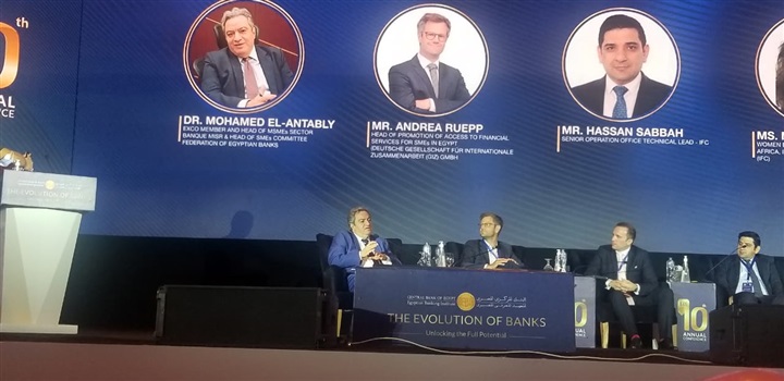 نقاش مؤتمر المعهد المصرفي المصري دور البنوك في دعم المشروعات الصغيرة والمتوسطة، بإدارة محمد العنتبلي، رئيس قطاع المشروعات الصغيرة والمتوسطة والتمويل متناهي الصغر ببنك مصر.