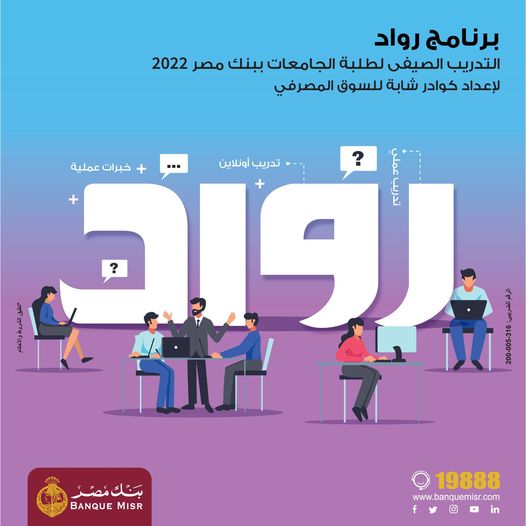أعلن بنك مصر، عبر صفحته الرسمية على موقع التواصل الاجتماعي “فيسبوك”، عن فتح باب التقديم في مبادرة التدريب الصيفي “برنامج رواد” لعام 2022، وذلك حرصاً من البنك على تحقيق الاستفادة لطلبة الجامعات، وتجهيز الجيل القادم من الكوادر الشبابية للسوق المصرفي لرفع وعي الطلاب بأنفسهم، وبنقاط تميزهم لاختيار الطريق المناسب لقدراتهم وشغفهم.