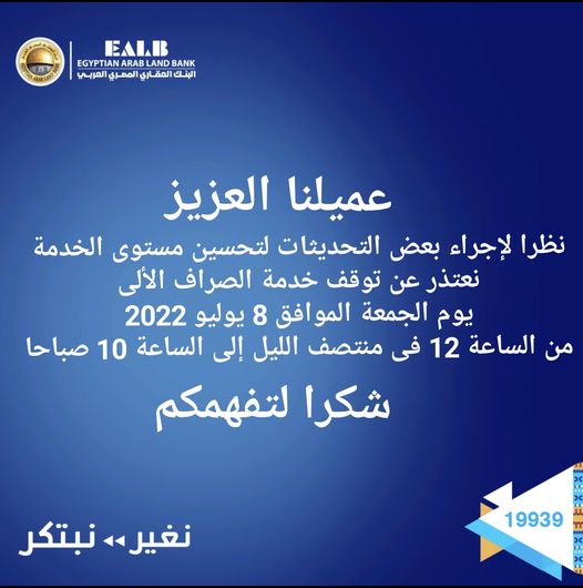 نوّه البنك العقاري المصري العربي، عملائه، إلى توقف خدمات الصراف الآلي يوم الجمعة الموافق 8 يوليو 2022، من الساعة 12 منتصف الليل، وحتى الساعة 10 صباحًا، وذلك نظرًا لقيام البنك بإجراء بعض التحديثات لتحسين مستوى الخدمة.