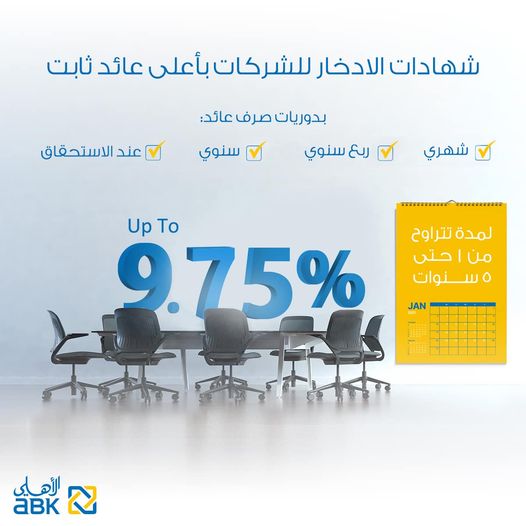. يقدم البنك الأهلي الكويتي- مصر، لعملائه شهادة الإدخار للشركات بأعلى عائد ثابت يصل إلى 9.75% سنويًا، وبدوريات صرف مختلفة تناسب كافة العملاء، وبمدد مختلفة تبدأ من سنة وتصل إلى 5 سنوات.