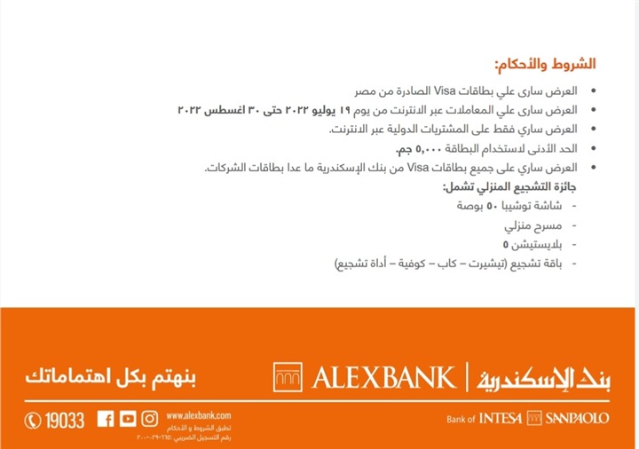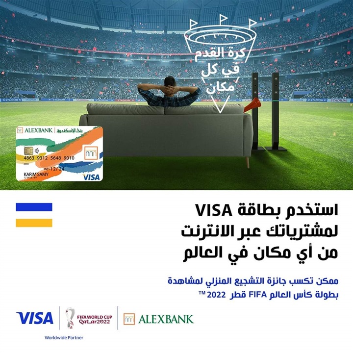 أعلن بنك الإسكندرية، لعملائه، عن إمكانية الحصول على جائزة التشجيع المنزلي لمشاهدة بطولة كأس العالم فيفا قطر TM2022، عند استخدام بطاقات Visa الائتمانية في الدفع لكل المشتريات على الإنترنت من أي مكان في العالم.