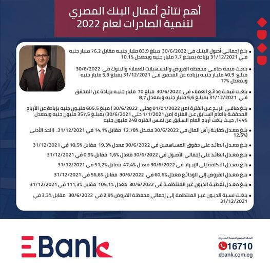 أعلن البنك المصري لتنمية الصادرات EBank، عن أهم نتائج أعماله خلال عام 2022، حيث بلغ إجمالي أصول البنك بنهاية شهر يونيو 2022 مبلغ 83,9 مليار جنيه مقابل 76,2 مليار جنيه بنهاية ديسمبر 2021 بزيادة بمبلغ 7,7 مليار جنيه، وبمعدل 10,1%.
