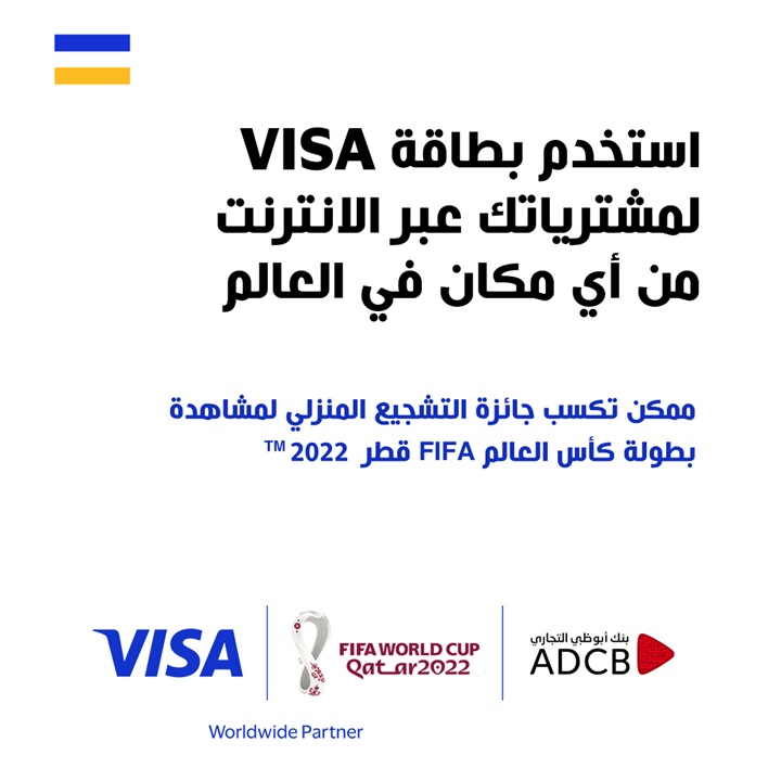 استخدم بطاقة Visa على كل المشتريات الدولية أونلاين وخليك واحد من الفائزين بجائزة التشجيع المنزلي لمشاهدة بطولة كاس العالم فيفا قطر ™2022.