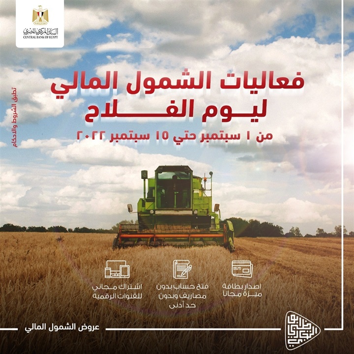 يأتي ذلك في إطار احتفال القطاع المصرفي بعيد الفلاح تحت رعاية البنك المركزي المصري، من خلال إتاحة فتح الحسابات مجانًا دون مصاريف إدارية، وبدون حد أدنى لفتح الحساب، وذلك ابتداء من يوم 1 وحتى يوم 15 سبتمبر 2022 من كل عام.