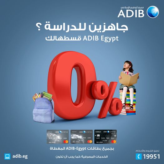 - تقسيط بربح 0٪ بدون أرباح عند استخدام البطاقات المغطاة من ADIB-Egypt في سداد مصاريف التعليم أو المستلزمات المكتبية.