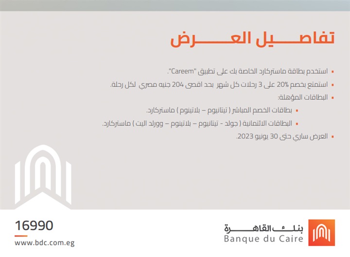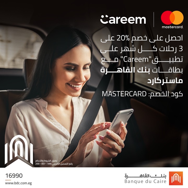 . أعلن بنك القاهرة، لعملائه، عن إمكانية الاستمتاع بخصم 20% على 3 رحلات من تطبيق “كريم – Careem” كل شهر بحد أقصى 204 جنيه مصري للرحلة.