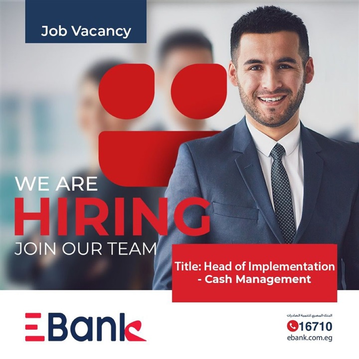 . أعلن البنك المصري لتنمية الصادرات، عبر صفحته الرسمية على موقع التواصل الإجتماعي LinkedIn، عن حاجته إلى Head of Implementation – Cash Management، ويشترط في المتقدم للوظيفة الآتي: