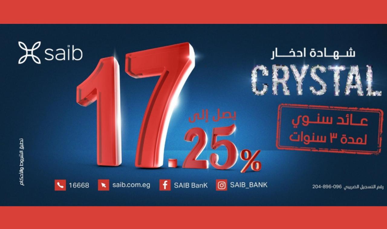 أعلن بنك saib، عبر صفحته الرسمية على موقع التواصل الاجتماعي “فيسبوك” لعملائه، عن طرح شهادة ادخار جديدة لمدة 3 سنوات شهادة “CRYSTAL” بعائد يصل إلى 17.25% سنويا، وبدوريات صرف مختلفة.