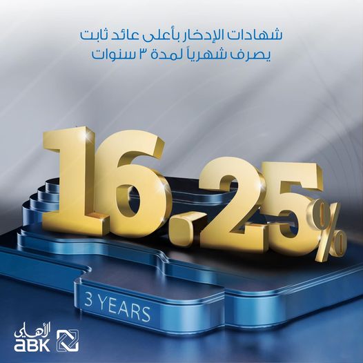 أعلن البنك الأهلي الكويتي- مصر، عبر صفحته الرسمية على موقع التواصل الاجتماعي “فيسبوك” لعملائه، عن طرح شهادة ادخار جديدة لمدة 3 سنوات، بعائد ثابت يصل إلى 16.25% سنويا، وبدورية صرف شهري، وربع سنوي.
