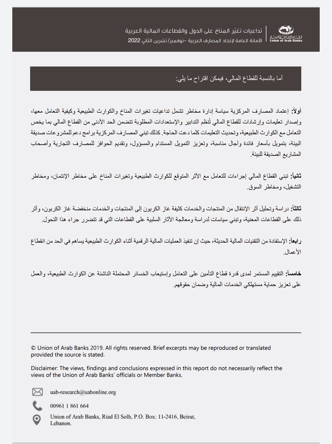 ووضع اتحاد المصارف العربية في نهاية الدراسة عدداً من التوصيات الموجهة الى القطاع المالي والمصرفي العربي التي تهدف إلى تعزيز الاستثمار والتمويل المستدام المسؤول في المنطقة العربية.
