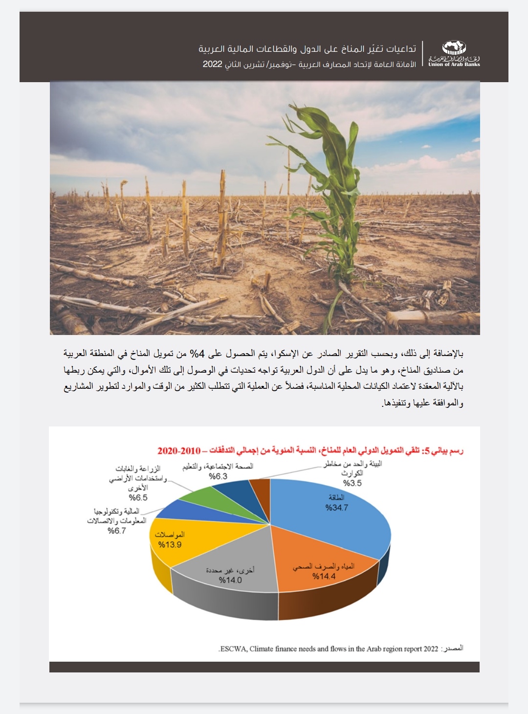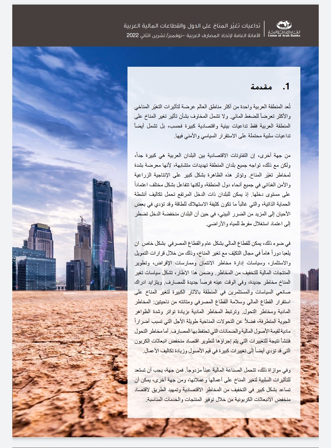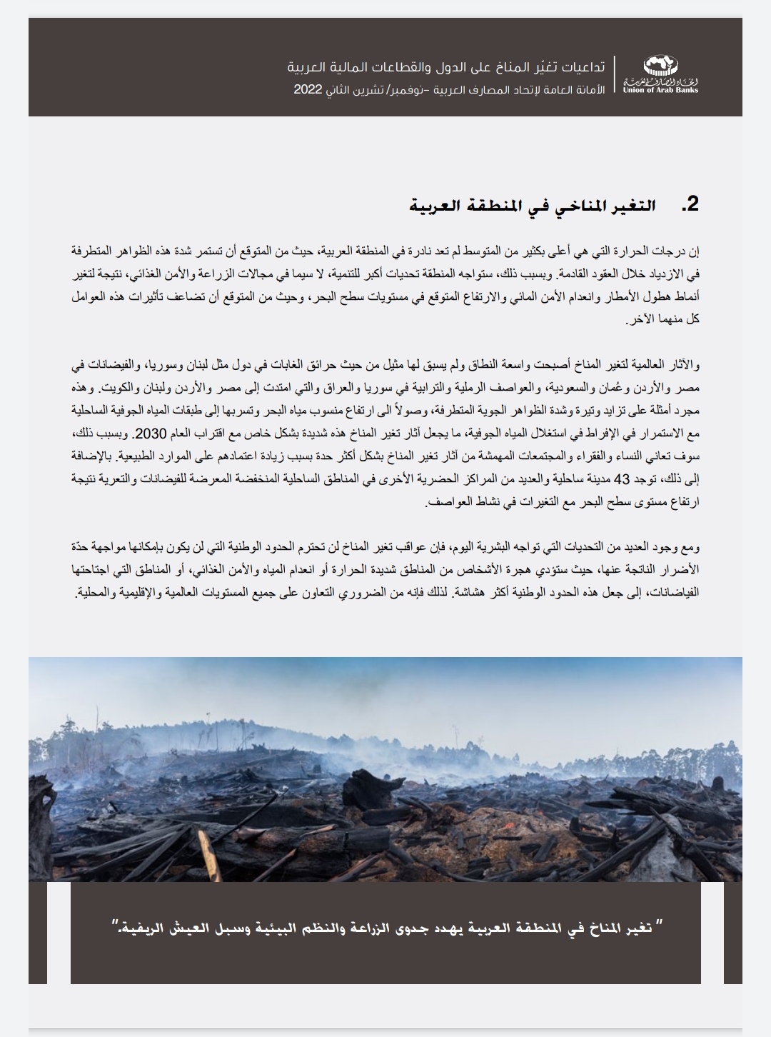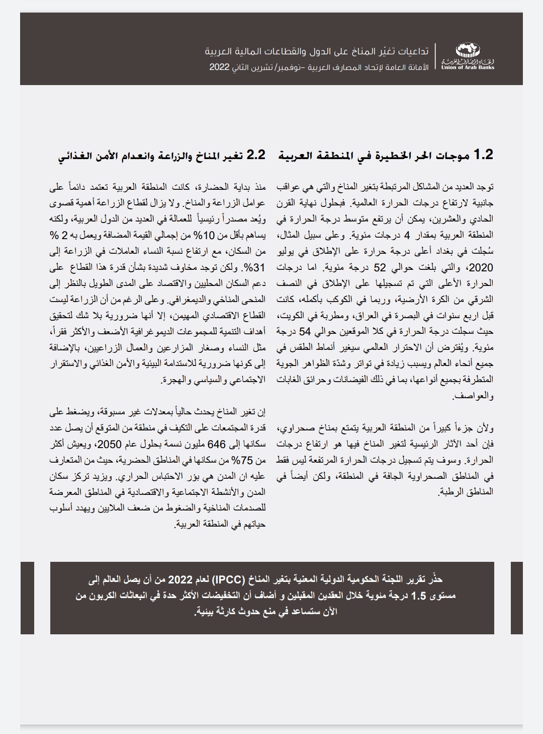 أصدر اتحاد المصارف العربية دراسة جديدة تناول خلالها قضية التغير المناخي وتداعياته على المنطقة العربية وقطاعاتها المالية، مستعرضاً خلالها مخاطر تغير المناخي في المنطقة العربية على الزراعة والبيئة والأمن الغذائي.