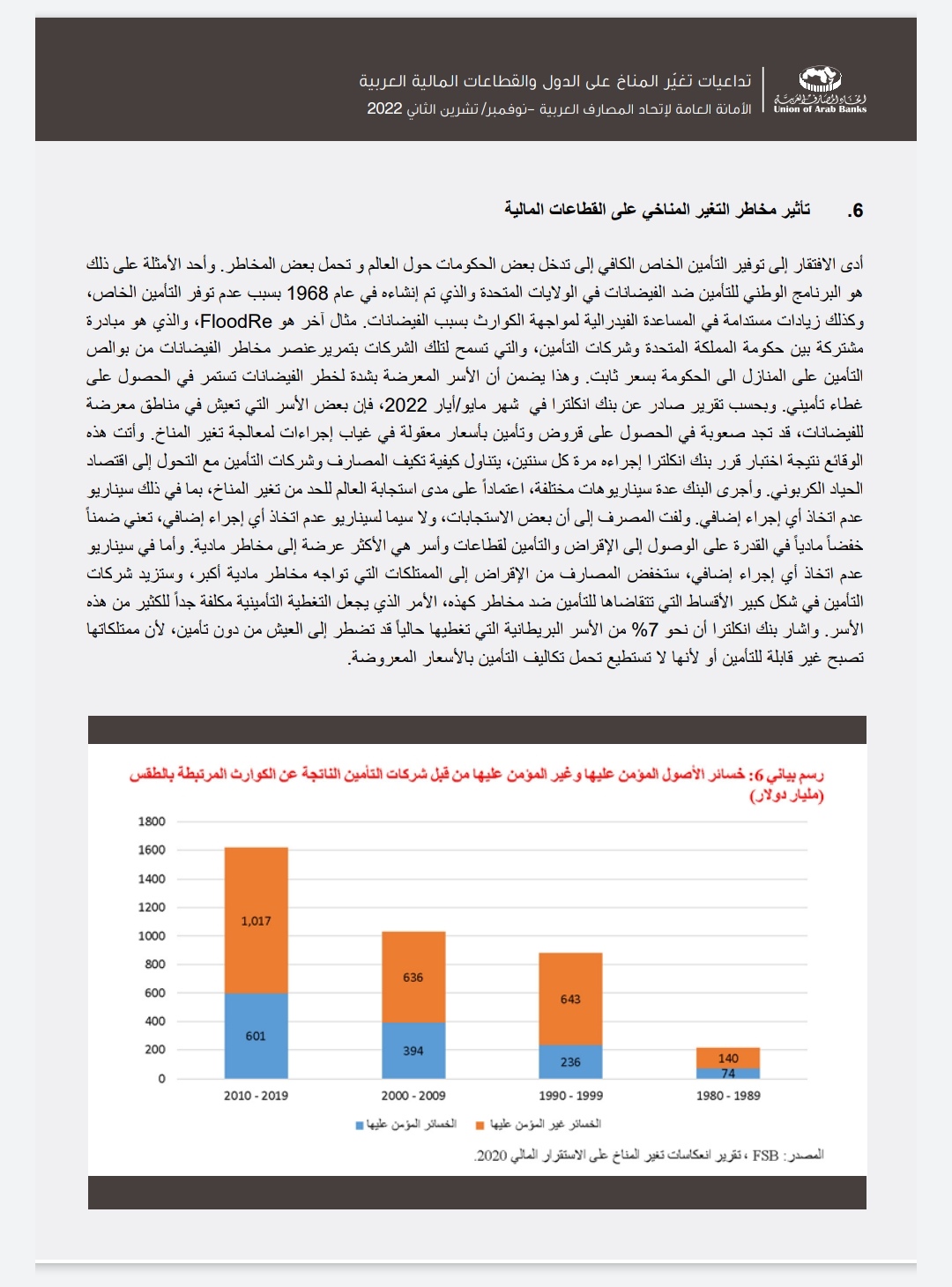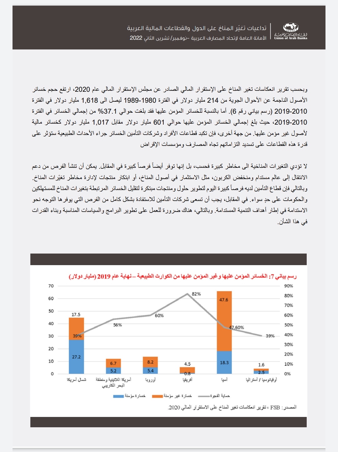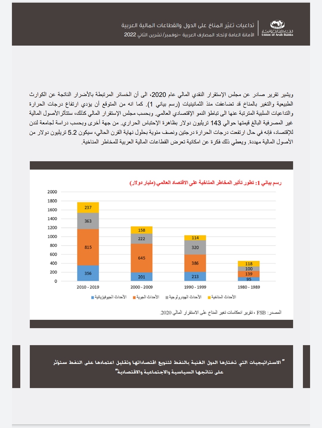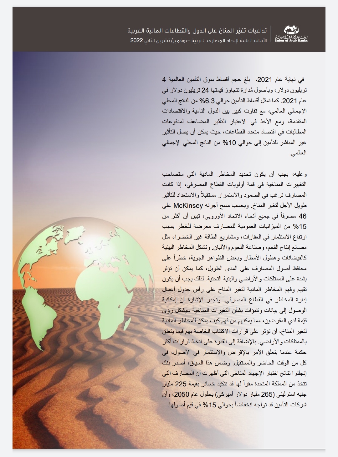 أصدر اتحاد المصارف العربية دراسة جديدة تناول خلالها قضية التغير المناخي وتداعياته على المنطقة العربية وقطاعاتها المالية، مستعرضاً خلالها مخاطر تغير المناخي في المنطقة العربية على الزراعة والبيئة والأمن الغذائي.