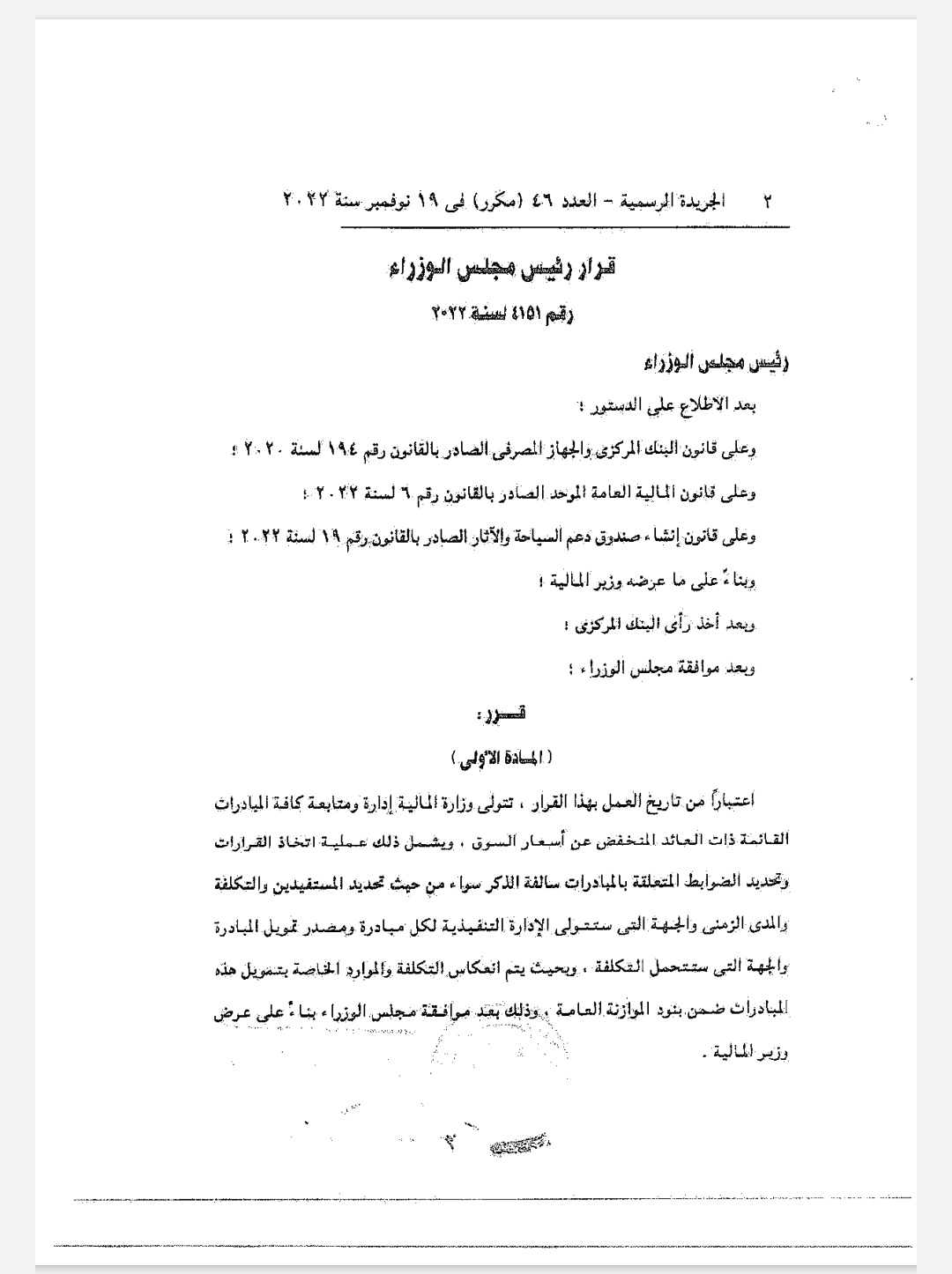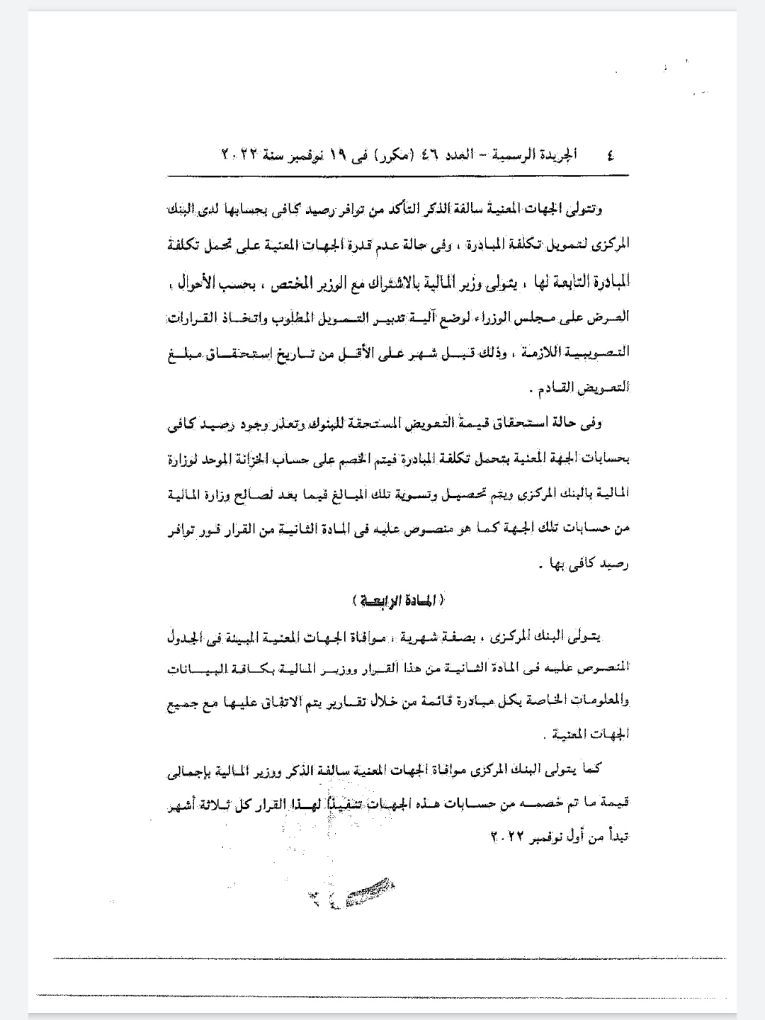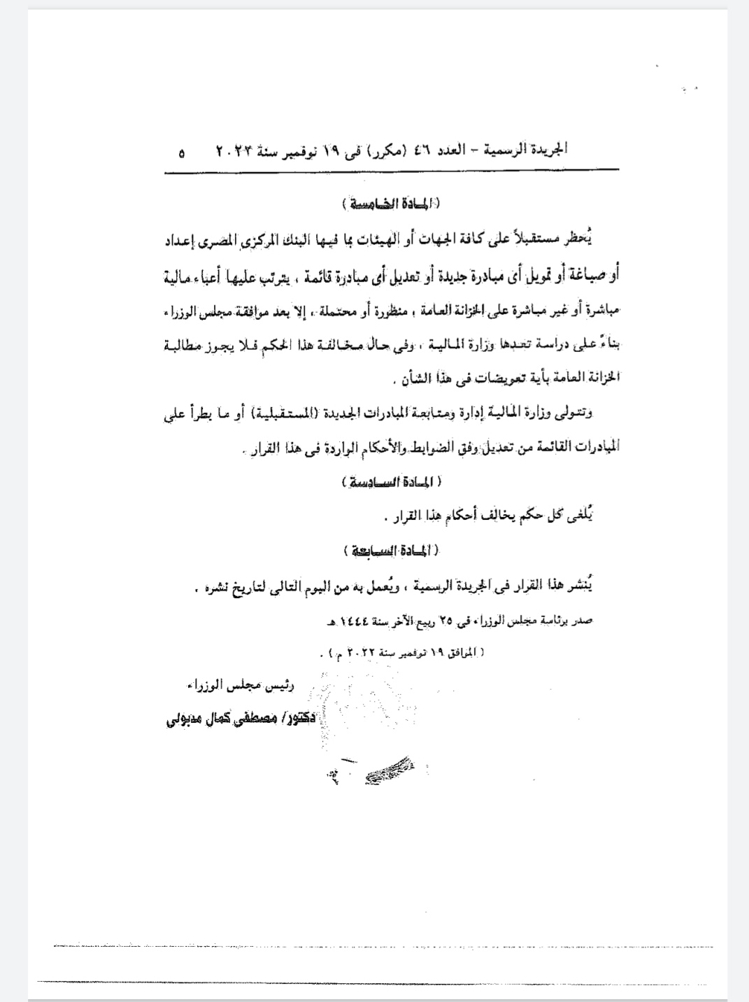 كما حظر القرار على جميع الجهات والهيئات وبما فيها البنك المركزي إعداد أو صياغة أو تمويل مبادرات جديدة، أو تعديل على أخرى قائمة يترتب عليها أعباء مباشرة أو تعديل على أخرى قائمة يترتب عليها أعباء مباشرة أو غير مباشرة على الخزانة العامة للدولة، إلا بعد العرض على مجلس الوزراء، بناء على دراسة تعدها وزارة المالية.
