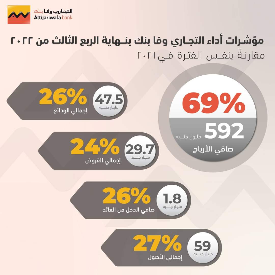 حقق التجاري وفا بنك إيجيبت رقمًا قياسيًا جديدًا خلال التسعة أشهر الأولى من عام 2022، حيث حقق البنك صافي ربح بعد الضرائب 592 مليون جنيه مصري مقابل 349 مليون جنيه مصري في 30 سبتمبر 2021 محققاً زيادة قياسية بنسبة 69%.