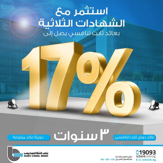 أعلن بنك قناة السويس رفع سعر العائد على الشهادة الادخارية لمدة 3 سنوات ذات العائد الثابت، ليصل العائد إلى 17% سنويا، وبدوريات صرف متنوعة، وبحد أدنى 1000 جنيه لشراء الشهادة.