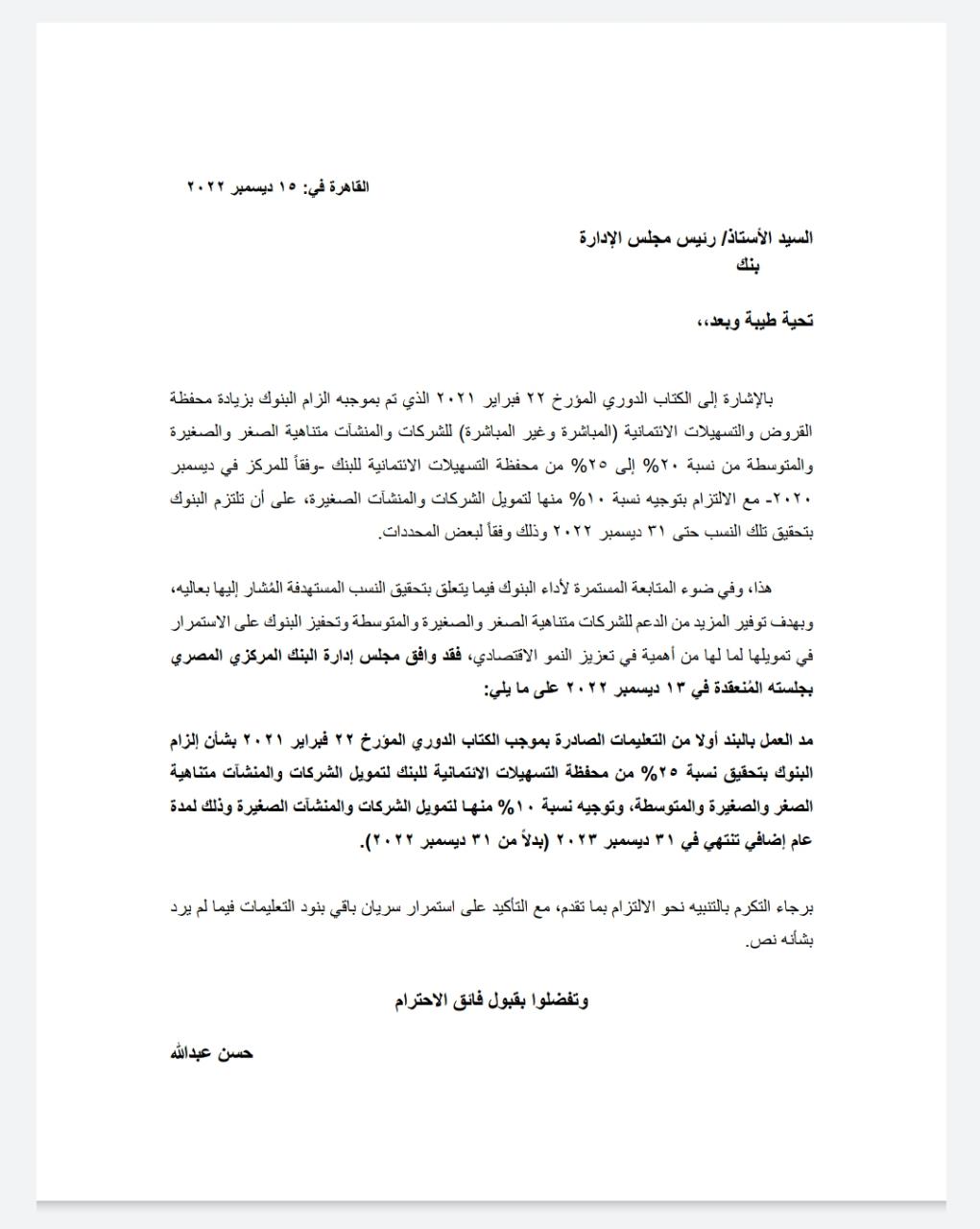 مدّ العمل بالبند أولا من التعليمات الصادرة بموجب الكتاب الدوري المؤرخ 22 فبراير 2021 بشأن إلزام البنوك بتحقيق نسبة 25% من محفظة التسهيلات الائتمانية للبنك لتمويل الشركات والمنشآت متناهية الصغر والصغيرة والمتوسطة، وتوجيه نسبة 10% منها لتمويل الشركات والمنشآت الصغيرة، وذلك لمدة عام إضافي تنتهي في 31 ديسمبر 2013 (بدلاً من 31 ديسمبر 2022).