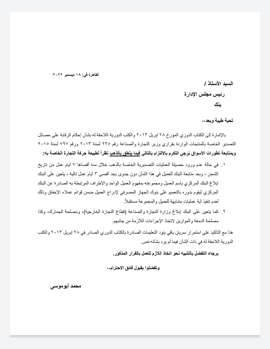 بالإشارة إلى الكتاب الدوري المؤرخ 28 أبريل 2013، والكتب الدورية اللاحقة له بشأن إحكام الرقابة على حصائل التصدير الخاصة بالمنتجات الواردة بقراري وزير التجارة والصناعة، رقم 235 لسنة 2013، ورقم 797 لسنة 2015، وبمتابعة تطورات الأسواق، يُرجى التكرم بالالتزام بالتالي فيما يتعلق بالذهب؛ نظراً لطبيعة حركة التجارة الخاصة به: