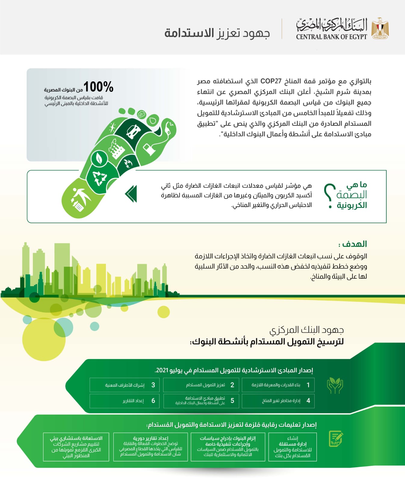 أعلن البنك المركزي المصري، عن انتهاء جميع البنوك من قياس البصمة الكربونية لمقراتها الرئيسية، بالتوازي مع مؤتمر قمة المناخ COP27 الذي استضافته مصر بمدينة شرم الشيخ.