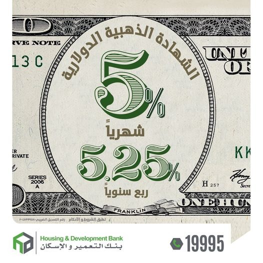 أعلن بنك التعمير والإسكان، عن طرح شهادة ادخار جديدة بالدولار الأمريكي “الشهادة الذهبية الدولارية الجديدة”، بعائد يصل إلى 5.25% سنويا، ولمدة 3 سنوات، وبحد أدنى 1000 دولار لشراء الشهادة.