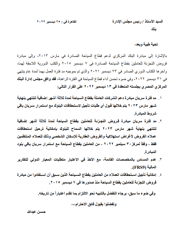بالإشارة إلى مبادرة البنك المركزي لدعم قطاع السياحة الصادرة في مارس 2013، وإلى مبادرة قروض التجزئة للعاملين بقطاع السياحة الصادرة في 7 ديسمبر 2015 والكتب الدورية اللاحقة لهما، وآخرها الكتاب الدوري الصادر في 23 ديسمبر 2021 والذي تم بموجبه مد فترة العمل بهما لمدة عام ينتهي في 31 ديسمبر 2022، وفي ضوء تحسن أداء قطاع السياحة في الفترة الراهنة، فقد وافق مجلس إدارة البنك المركزي المصري بجلسته المنعقدة في 13 ديسمبر 2022 على القرار التالي:
