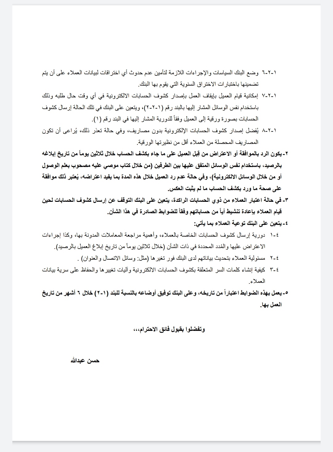 ۲-۱-۱ يكون البنك مسؤولاً في كل الأحول عن التأخير في تسليم كشوف الحسابات، وكذا الإخلال بمبادئ حماية سرية بيانات العملاء.