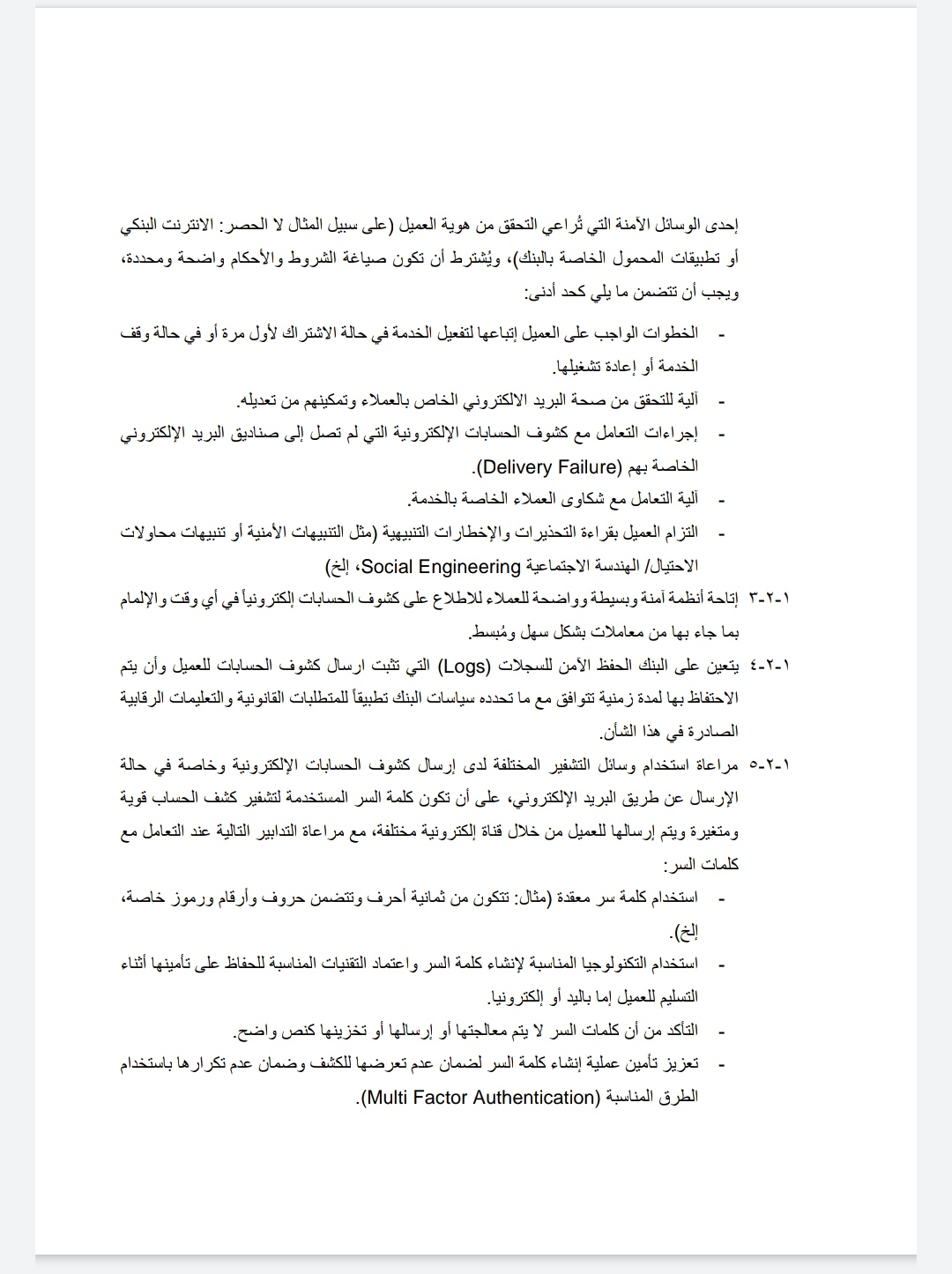 ١-٢-٥ مراعاة استخدام وسائل التشفير المختلفة لدى إرسال كشوف الحسابات الإلكترونية، وخاصة في حالة الإرسال عن طريق البريد الإلكتروني، على أن تكون كلمة السر المستخدمة لتشفير كشف الحساب قوية ومتغيرة، ويتم إرسالها للعميل من خلال قناة إلكترونية مختلفة مع مراعاة التدابير التالية عند التعامل مع كلمات السر: