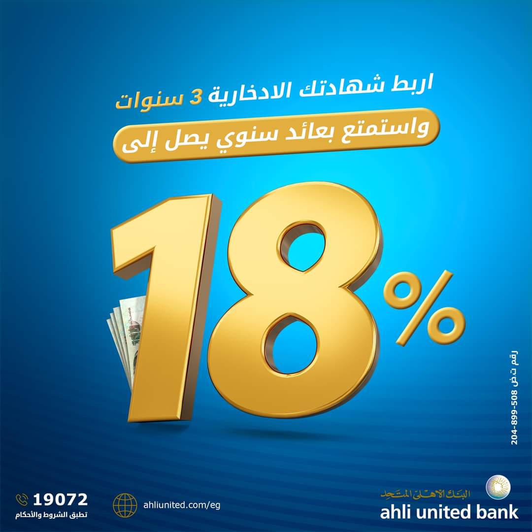 قرر البنك الأهلي المتحد- مصر، طرح شهادة ادخار جديدة لمدة 3 سنوات بالجنيه المصري، وبعائد ثابت يصل إلى 18% سنويا، وبدوريات صرف متنوعة، وبحد أدنى 5000 جنيه لشراء الشهادة.