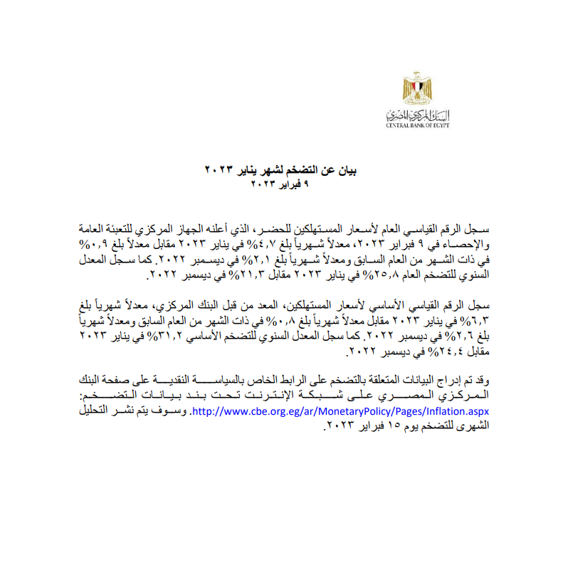 كما أوضحت بيانات الجهاز المركزي للتعبئة العامة والإحصاء، أن معدل التضـخم السنوي لإجمالي الجمهورية سجل (26.5%) لشهر يناير 2023 مقابل (8.0%) لنفس الشهـر من العام السابق.
