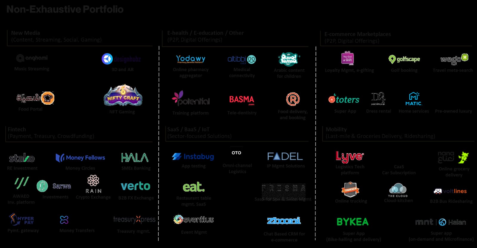 ساعدت شركة ميدل إيست فينتشر بارتنرز أيضًا شركة الدفع الذكي “هايبرباي”، ومنصة التكنولوجيا الصحية “الطبي”، و”التطبيق الفائق” في باكستان “بيكيا” الذي يوفر خدمات النقل وتوصيل الطعام والتحويلات النقدية في التوسع.