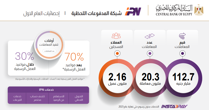 أعلن البنك المركزي المصري، عن إحصائيات العام الأول لشبكة المدفوعات اللحظية (انستا باي)، حيث حققت معاملات بقيمة 112.7 مليار جنيه خلال العام الأول منذ إطلاقها.