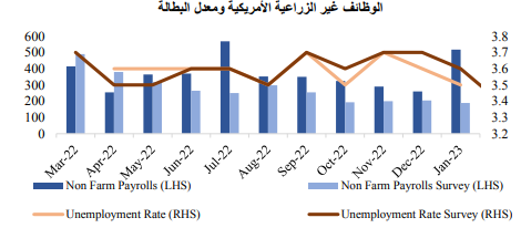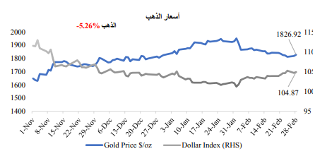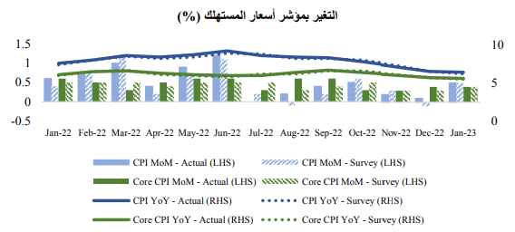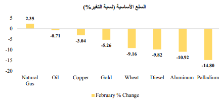 انخفضت أسعار العقود الآجلة للغاز الطبيعي في أوروبا بسبب ارتفاع مستويات المخزون. ومع ذلك، ارتفعت الأسعار العالمية بسبب الانخفاض في حجم المعروض عل المستوى العالمي. وعكس النحاس والألومنيوم بعض مكاسب شهر يناير المرتبطة بإعادة فتح الصين في حركة تصحيح للأسعار. وساعد الانخفاض في أسعار السلع الأساسية على احتمالية استمرار رؤية اتجاهات هبوطية في الضغوط التضخمية.